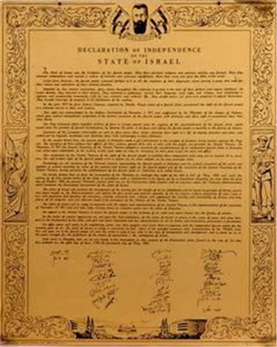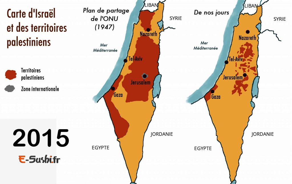 En 1948, le chef des sioniste déclare (unilatéralement) l’existence de l’Etat d’Israël. De plus, Israël annexe de nombreux territoires palestiniens qui étaient, dans le plan de partage de l’ONU, destinés aux peuples arabes. C’est le début de la première guerre israëlo-arabe qui dure jusqu’en 1949 et oppose Israël à la Ligue arabe. En 1949 toujours, commence la diaspora palestinienne vers d’autres pays alentours, tandis que l’Egypte administre la bande de Gaza et la Transjordanie administre la Cisjordanie. Israël est admise à l’ONU mais n’est pas reconnue par les pays arabes.